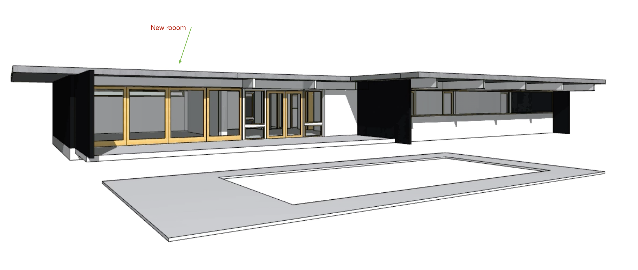 - Add a new living room/family room to the Eastern side of the house, as though it was always there. This is an easy add on because the existing living room has big corner windows which would be opened up to allow entry to another great space.