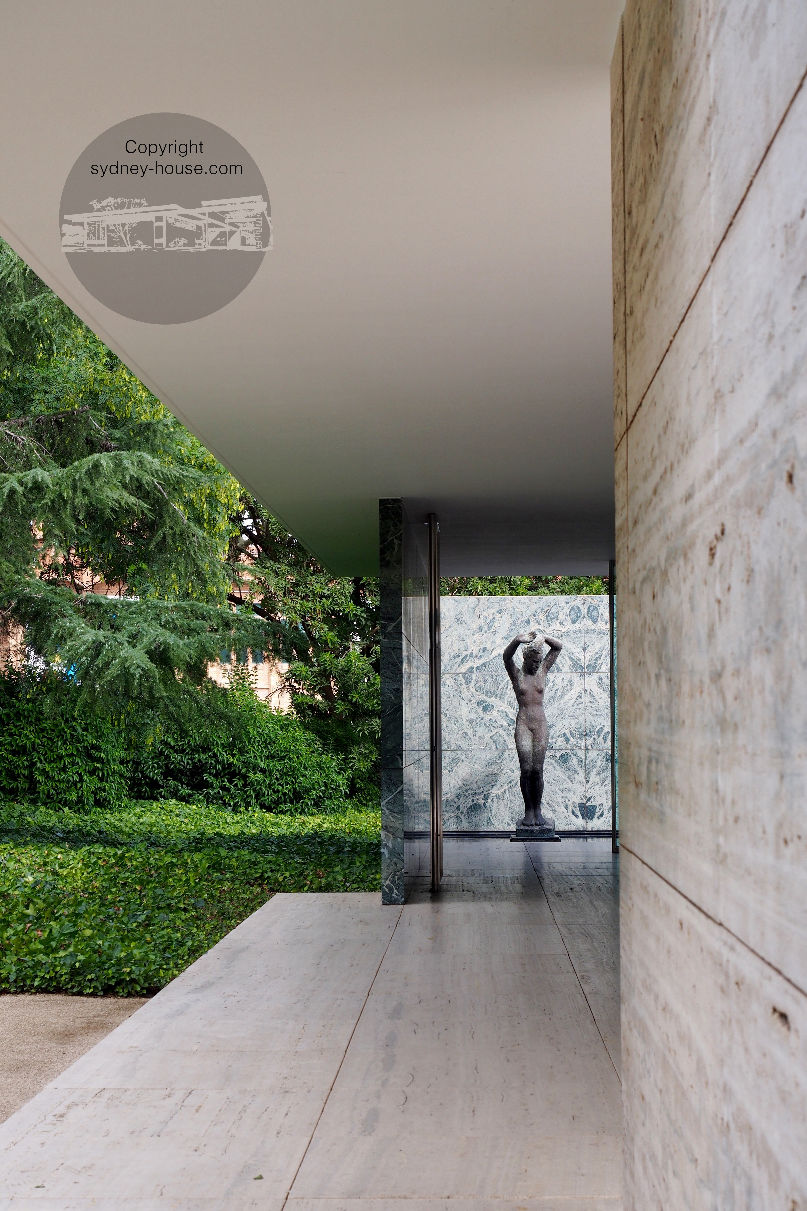 The travertine floors and walls flow out to two reflecting pools at either end: one pebble pool and a reflective pool featuring Georg Kolbe’s “Dawn” sculpture reproduction. Made from bronze, the sculpture is reflected in the water and in the marble and glass, making you think that it is sitting in multiple places. Curves contrast with the geometry of the space.