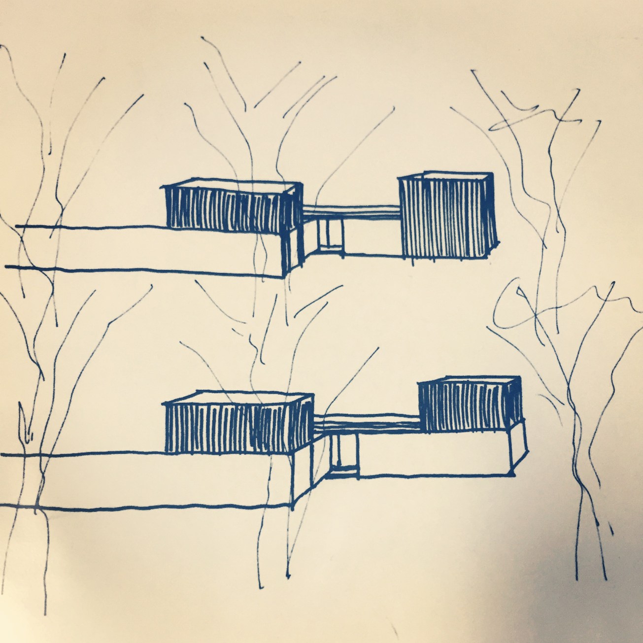 Alex did a brief sketch or two, focussing mainly on the external form, and conceptualising how we might increase space against the existing, single storey Lowline form (in the sketch, the existing house are the white areas). We sent it to Sam our architect.
