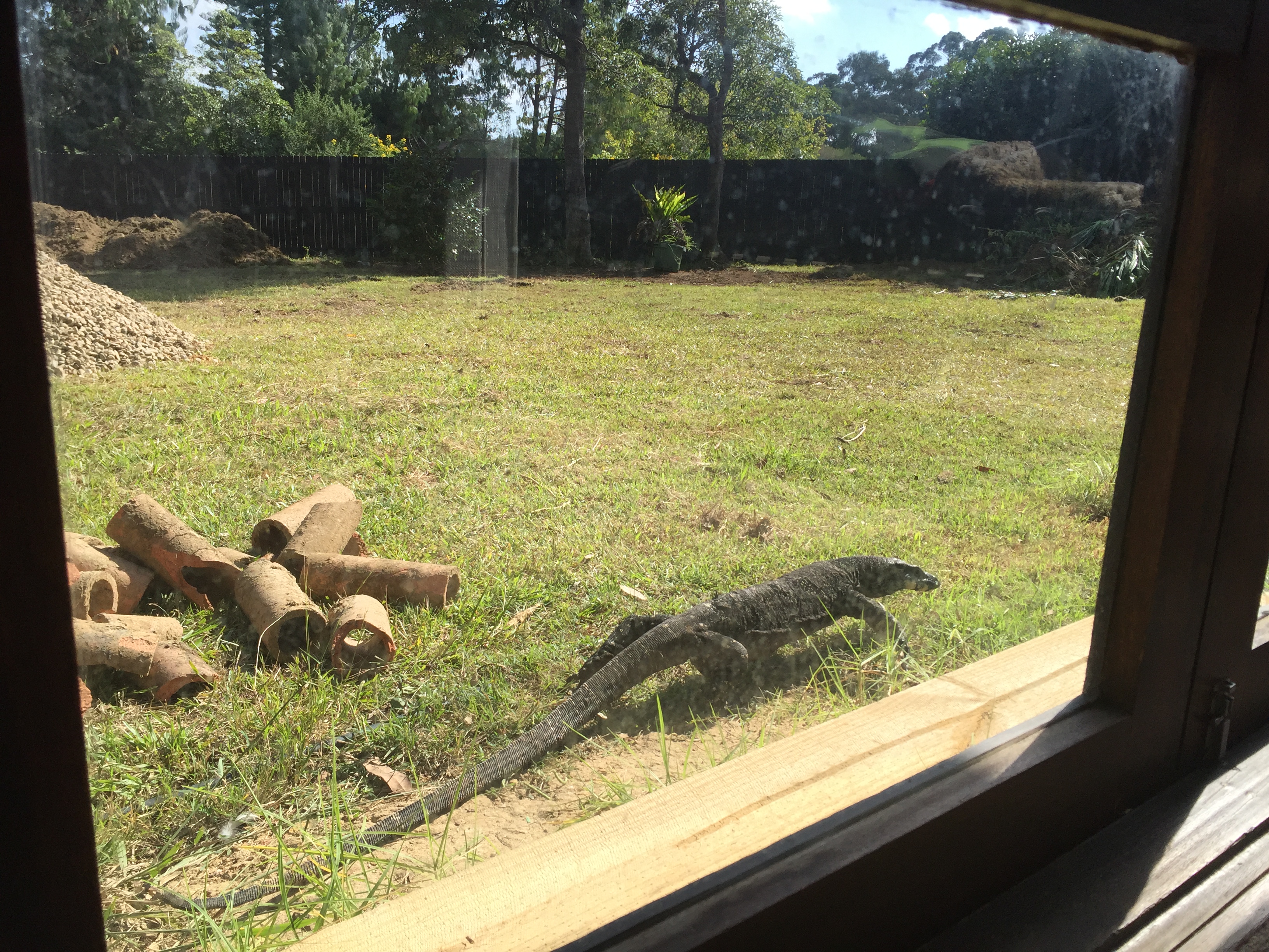 We had a visitor, the local monitor lizard dropped by …curious about all the digging. Old pipes in the foreground were discovered during the dig