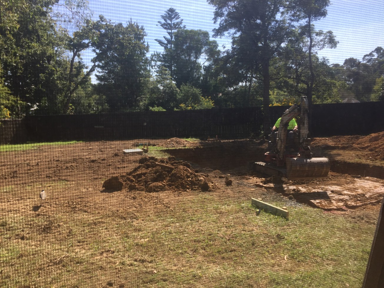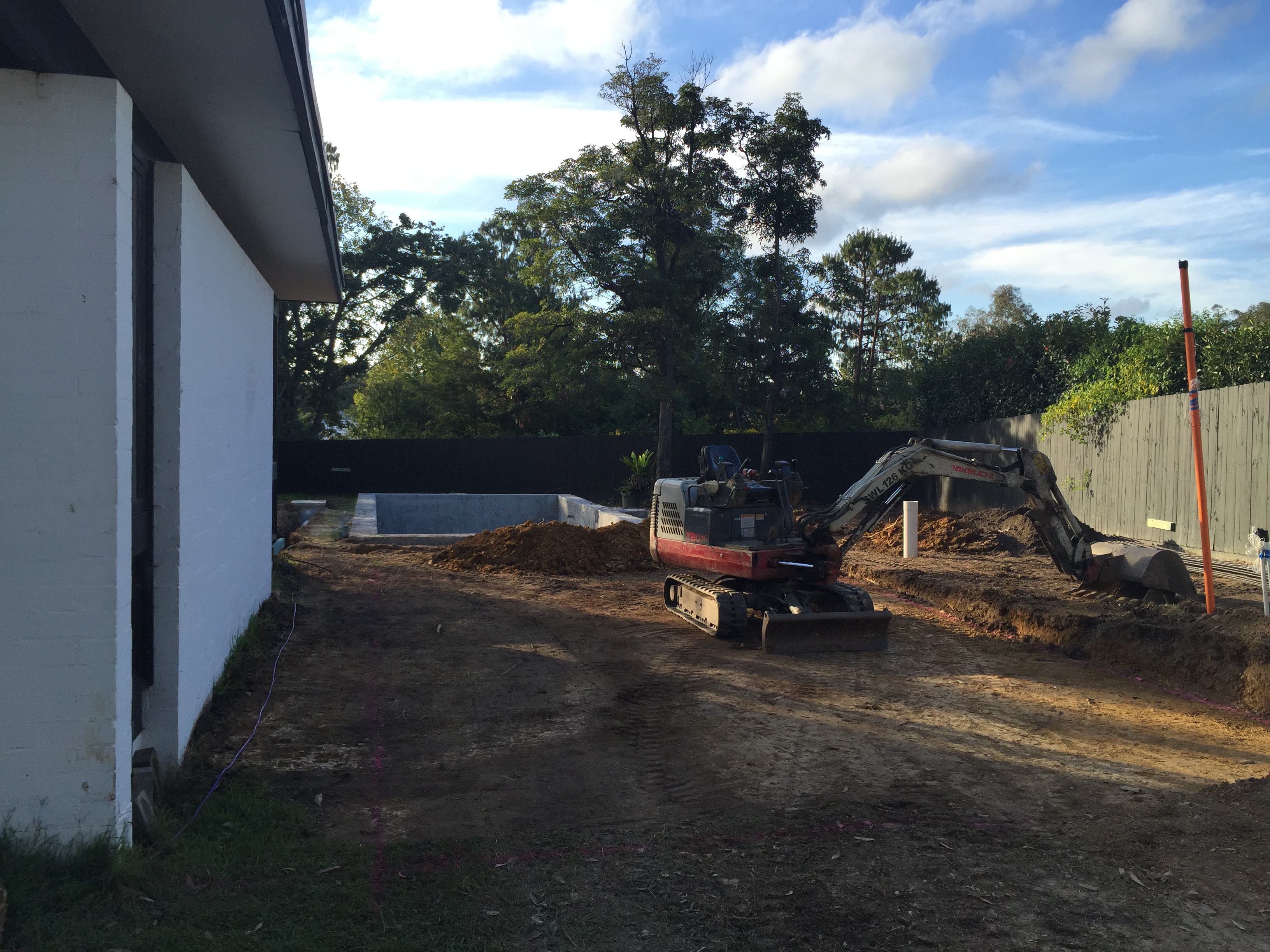 So, off we go. Our new excavator is soon to become an absolutely champion in our mind: digging both the drainage pit, then filling it with bluestone (another expensive option) and filling it with dirt after the trenches and plumbing is laid. Then, he dug the pool. And moved all the excess soil (boy was there a lot!) off site. And then prepared the foundation area for our extension. His work has been amazing. All up we expect to spend $10,000 – 15,000 on earthworks and frankly, for the amount of dirt moved on our 1200+ sqm block – that is a very good outcome. He’s charged us by the hour and it’s helped us manage cash each week.