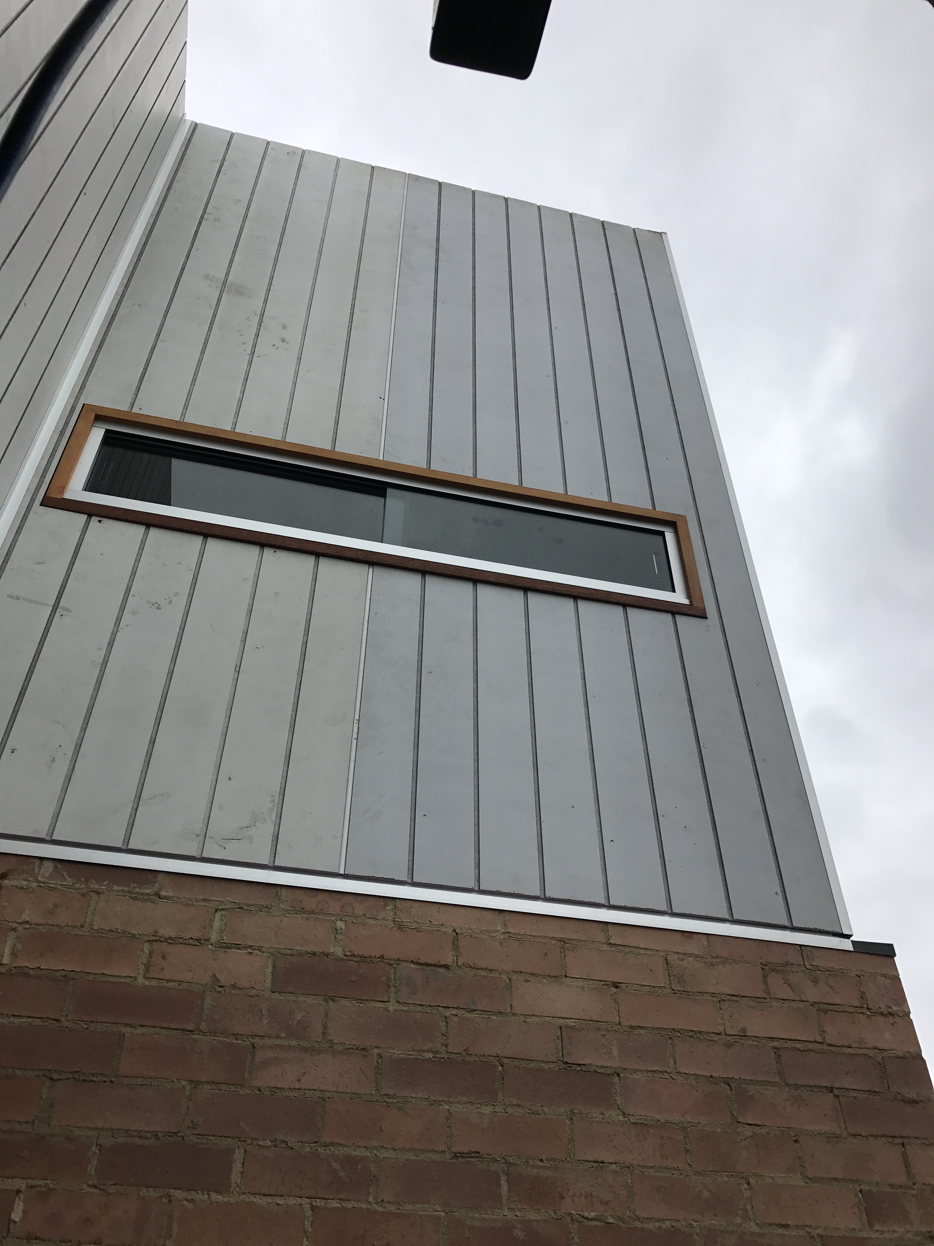 A horizontal sashless peek-a-boo window upstairs, shown with unpainted cladding.