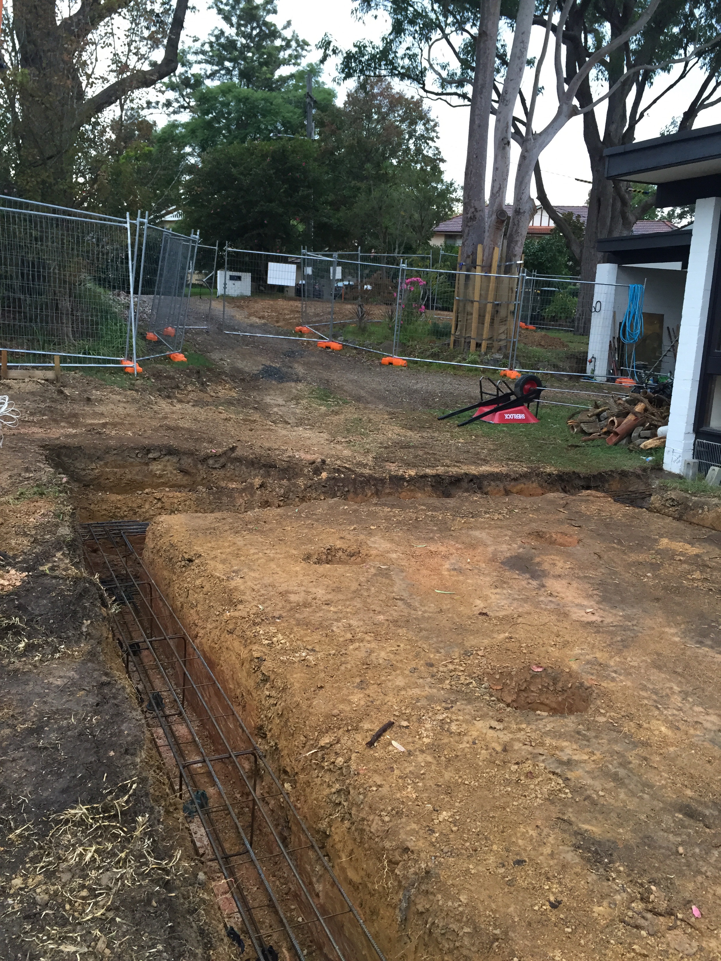 May 2016: Trenches with reinforced steel ready for footings. Pool construction fencing to the rear as per legal requirements. We decided to buy our own as renting fencing can be expensive if your build stretches beyond a set time.
