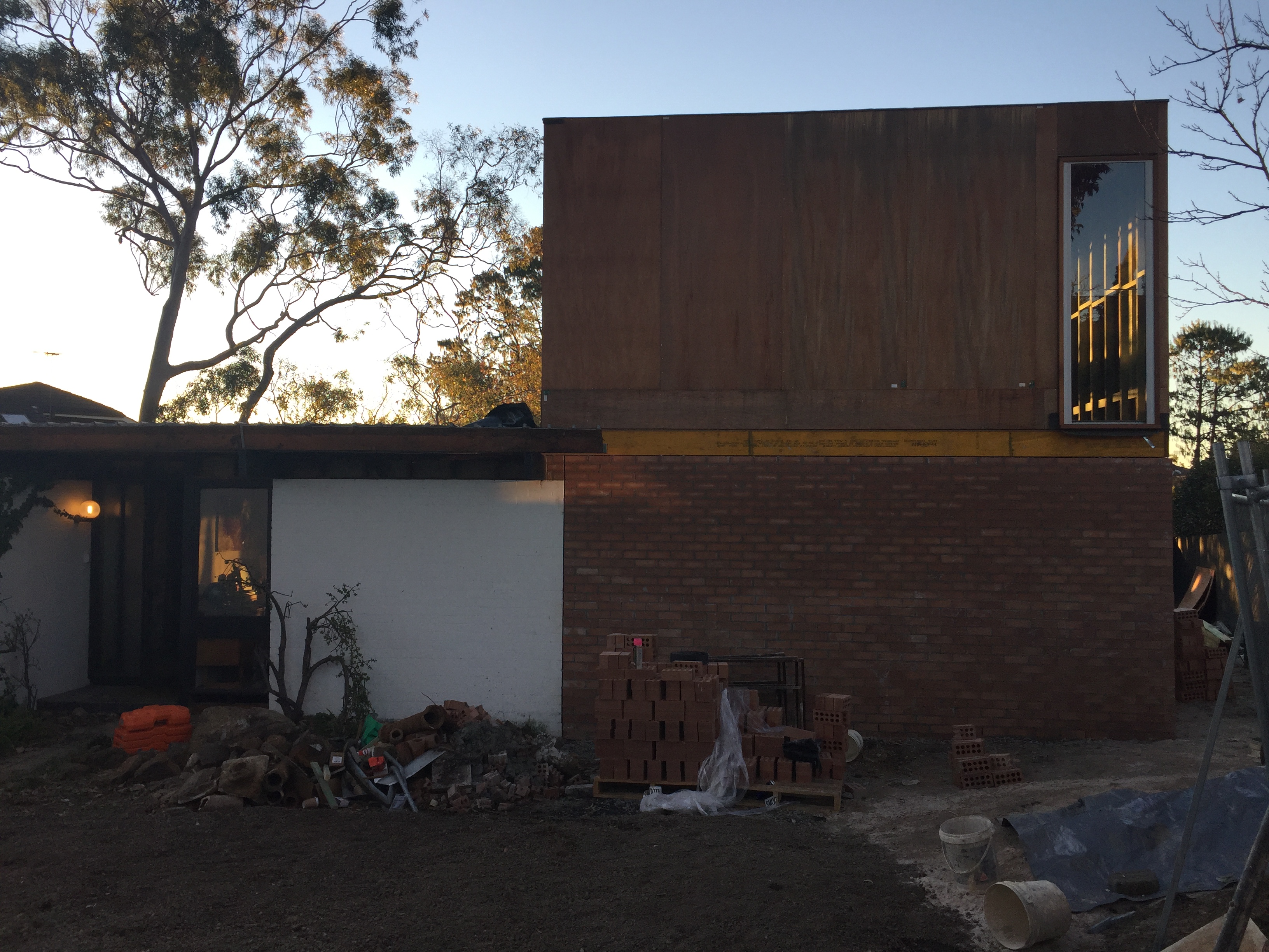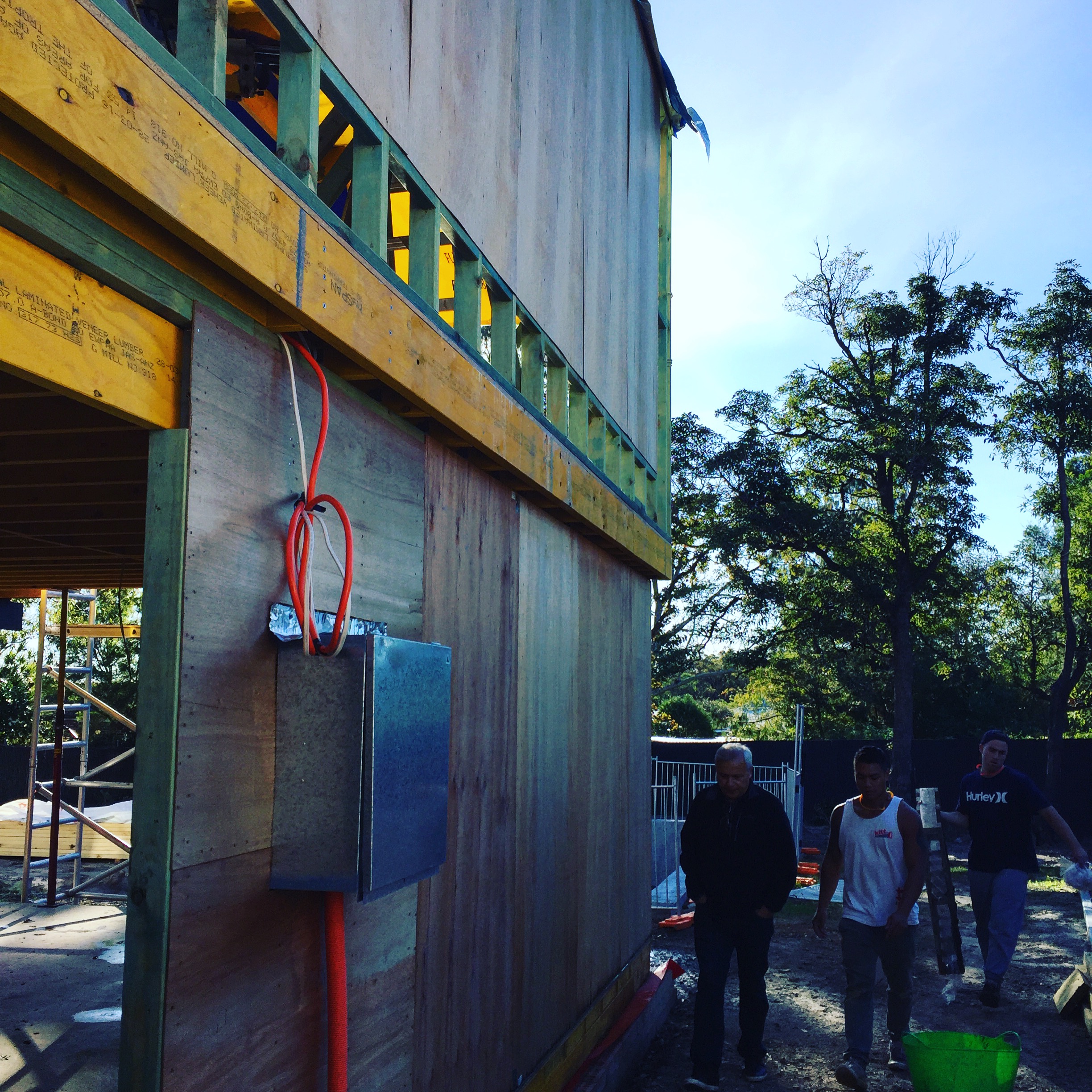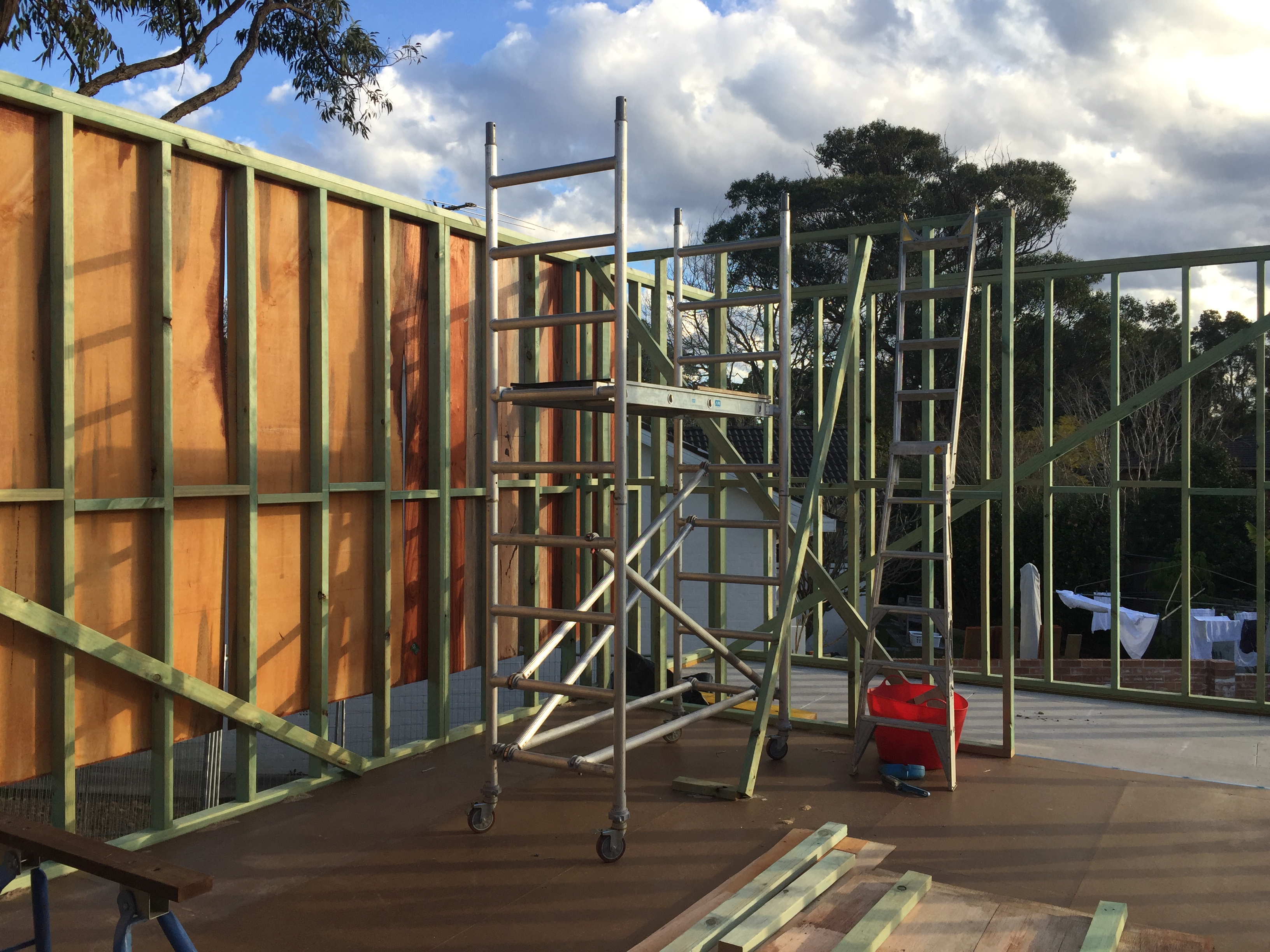 July 2016: The eastern side of the new extension with plywood structural bracing in progress. We also had to pay handsome sums of money approximately $7000 for an ASP Level 2 Electrician – for the power lines and electricity box to be moved. Only certain qualified electricians are allowed to work with power lines. Suburbs throughout Australia seem to have ugly overhead power cabling everywhere. In our case, the lines were joined to the front of the house and had to be removed for any building work to occur. We’ve placed it underground. Yes, more digging! But worth it. By July the weather is getting wetter.