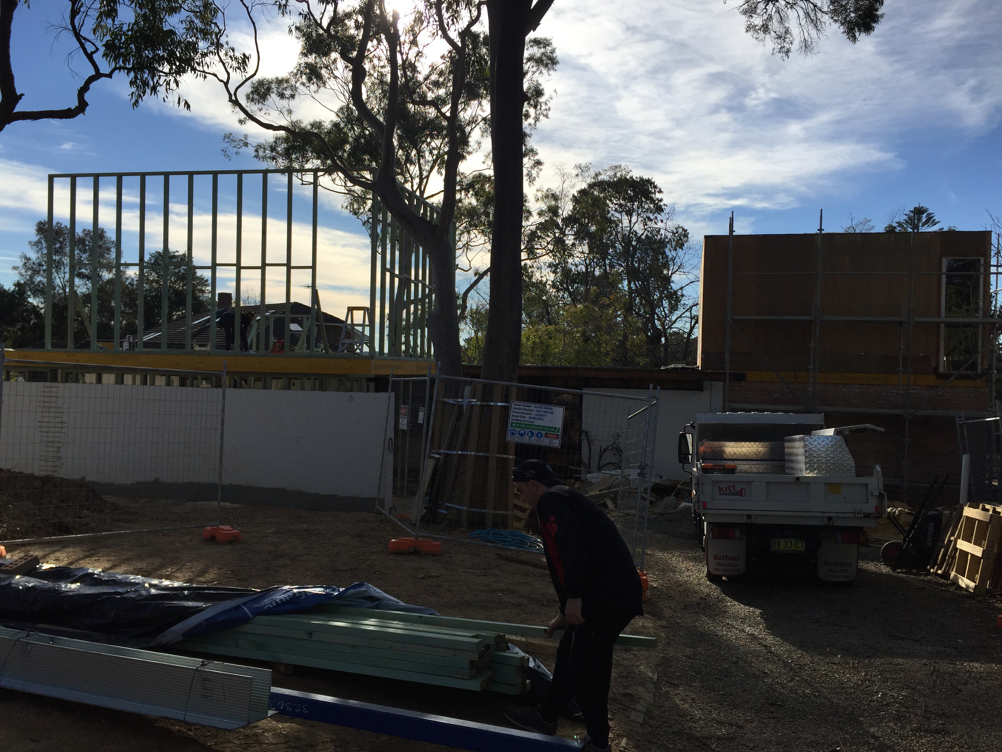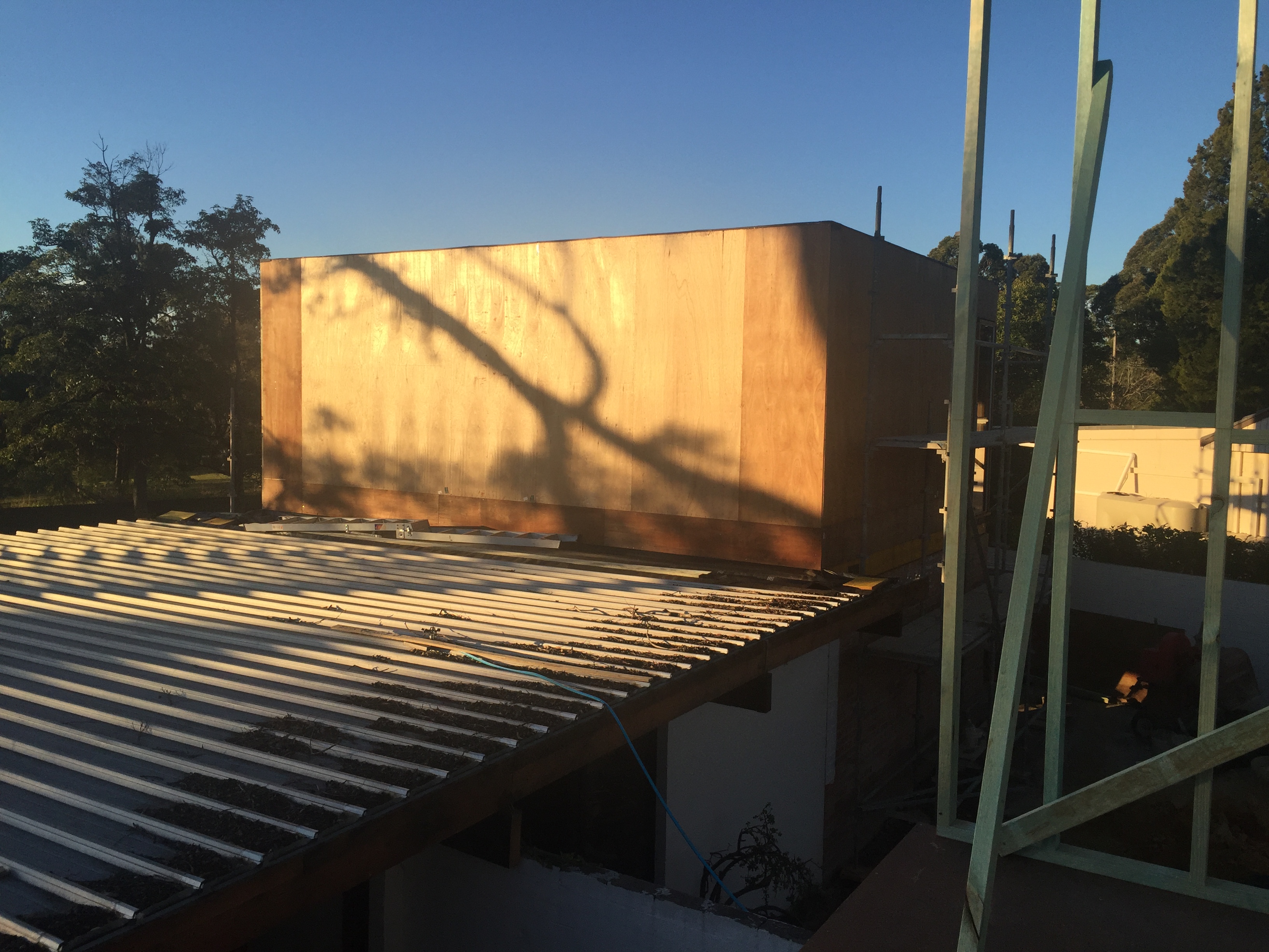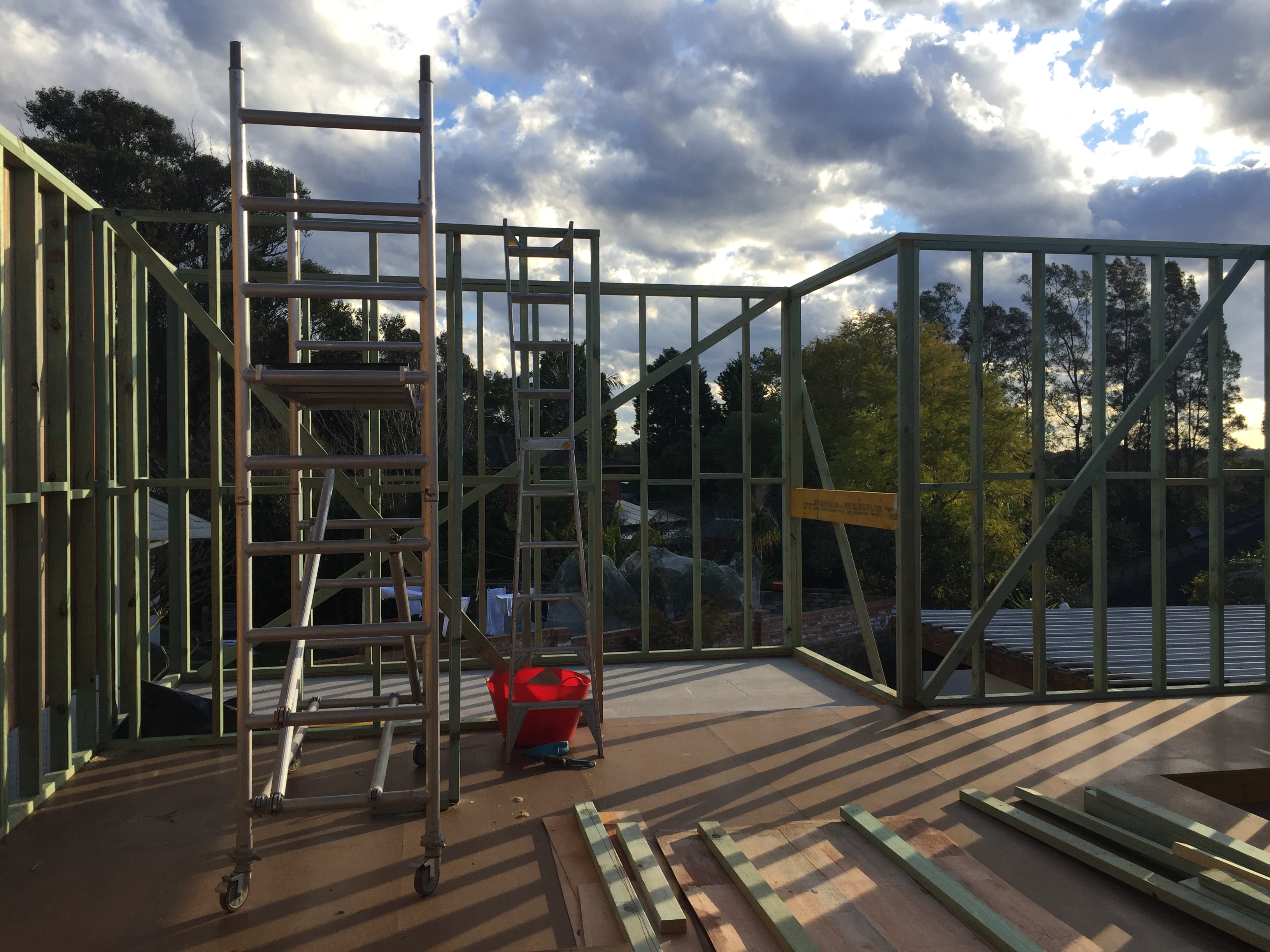 July 2016: The eastern side of the new extension with plywood structural bracing in progress. We also had to pay handsome sums of money approximately $7000 for an ASP Level 2 Electrician – for the power lines and electricity box to be moved. Only certain qualified electricians are allowed to work with power lines. Suburbs throughout Australia seem to have ugly overhead power cabling everywhere. In our case, the lines were joined to the front of the house and had to be removed for any building work to occur. We’ve placed it underground. Yes, more digging! But worth it. By July the weather is getting wetter.