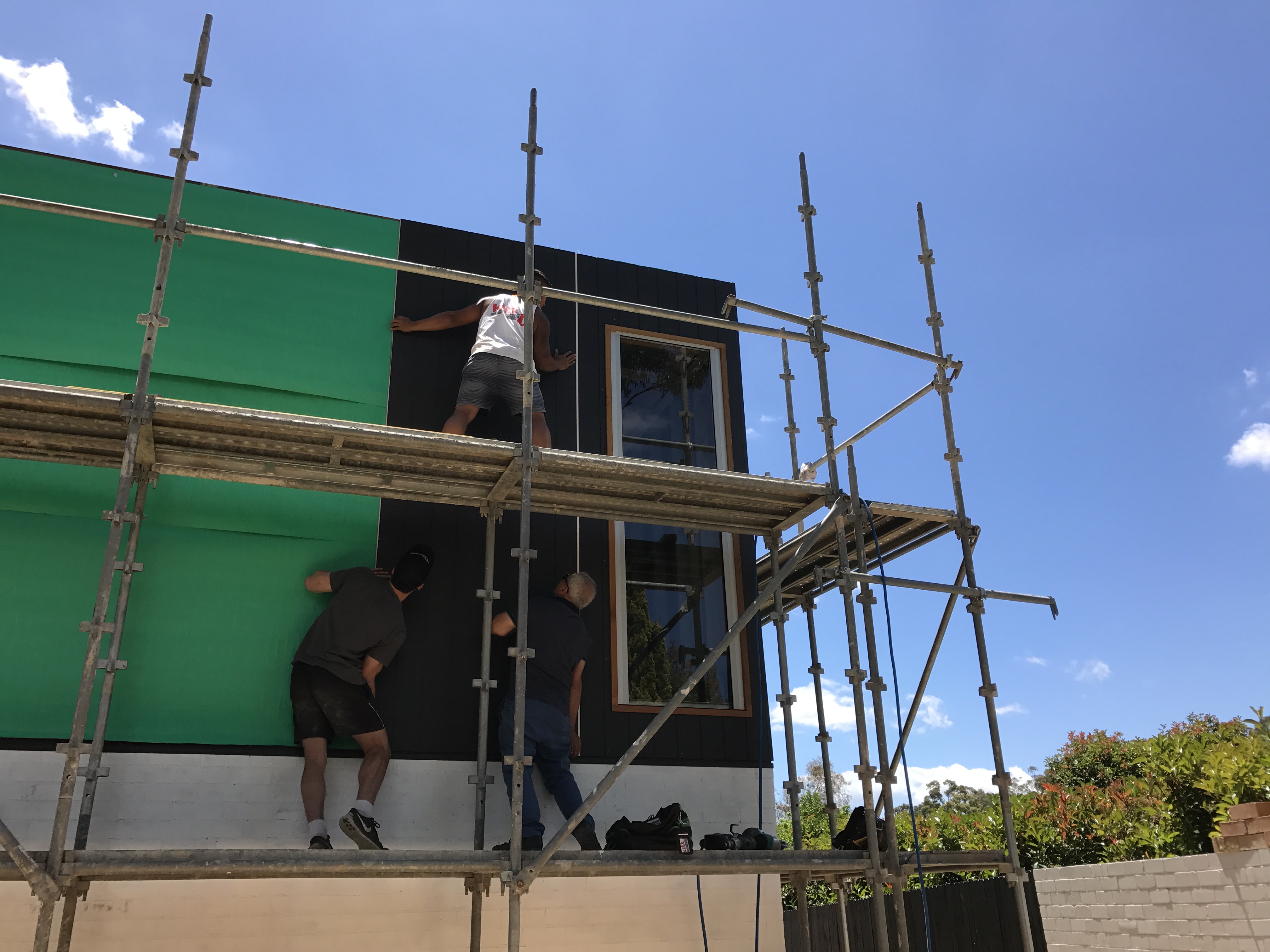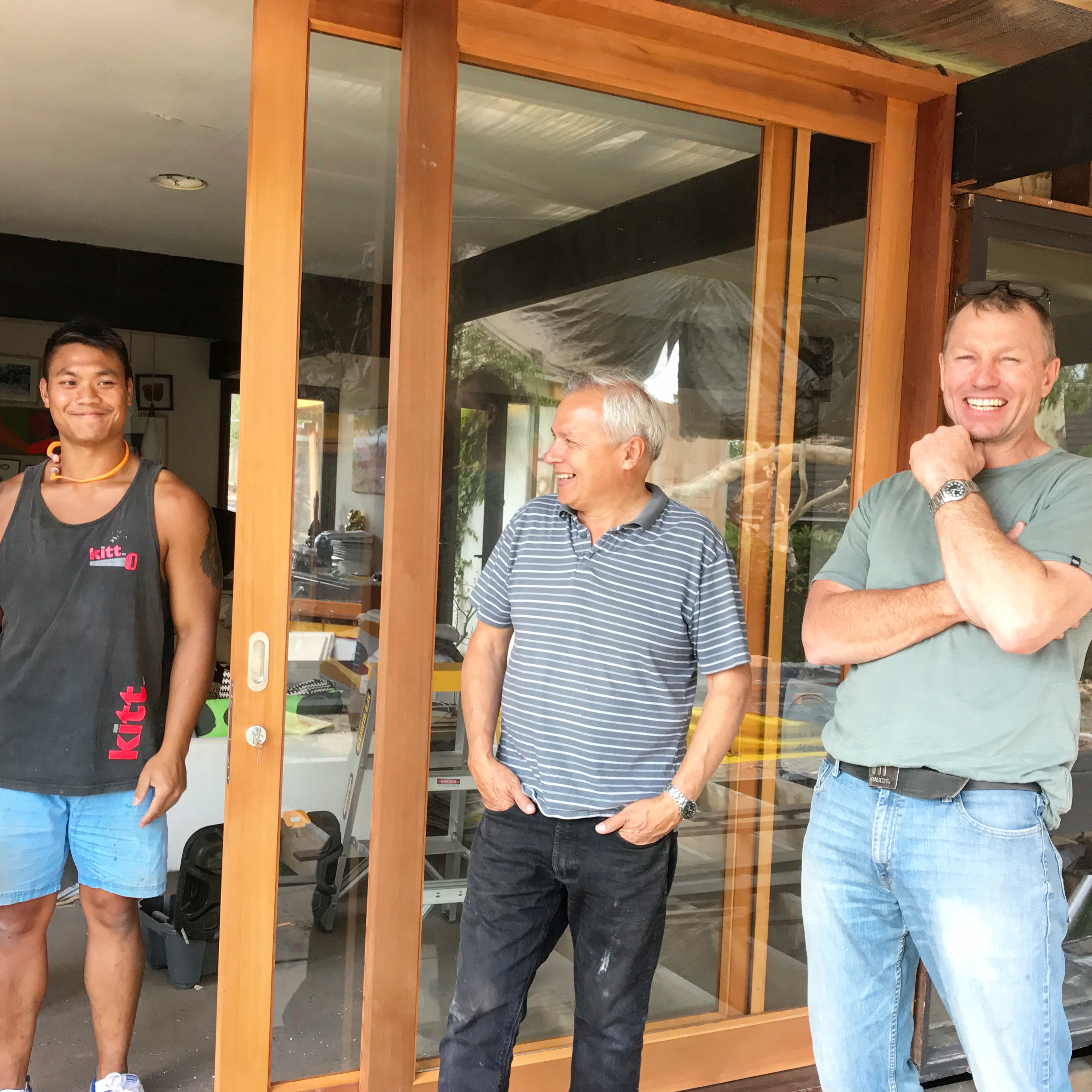 November 2016: Looking pretty happy after installing a replacement sliding door in the old part of the house so that it goes right up to the 2400mm heigh ceilings. Left to right: Kitt our builder, with Alex and Andrew Moar from Moar Windows & Doors. They’re all awesome.