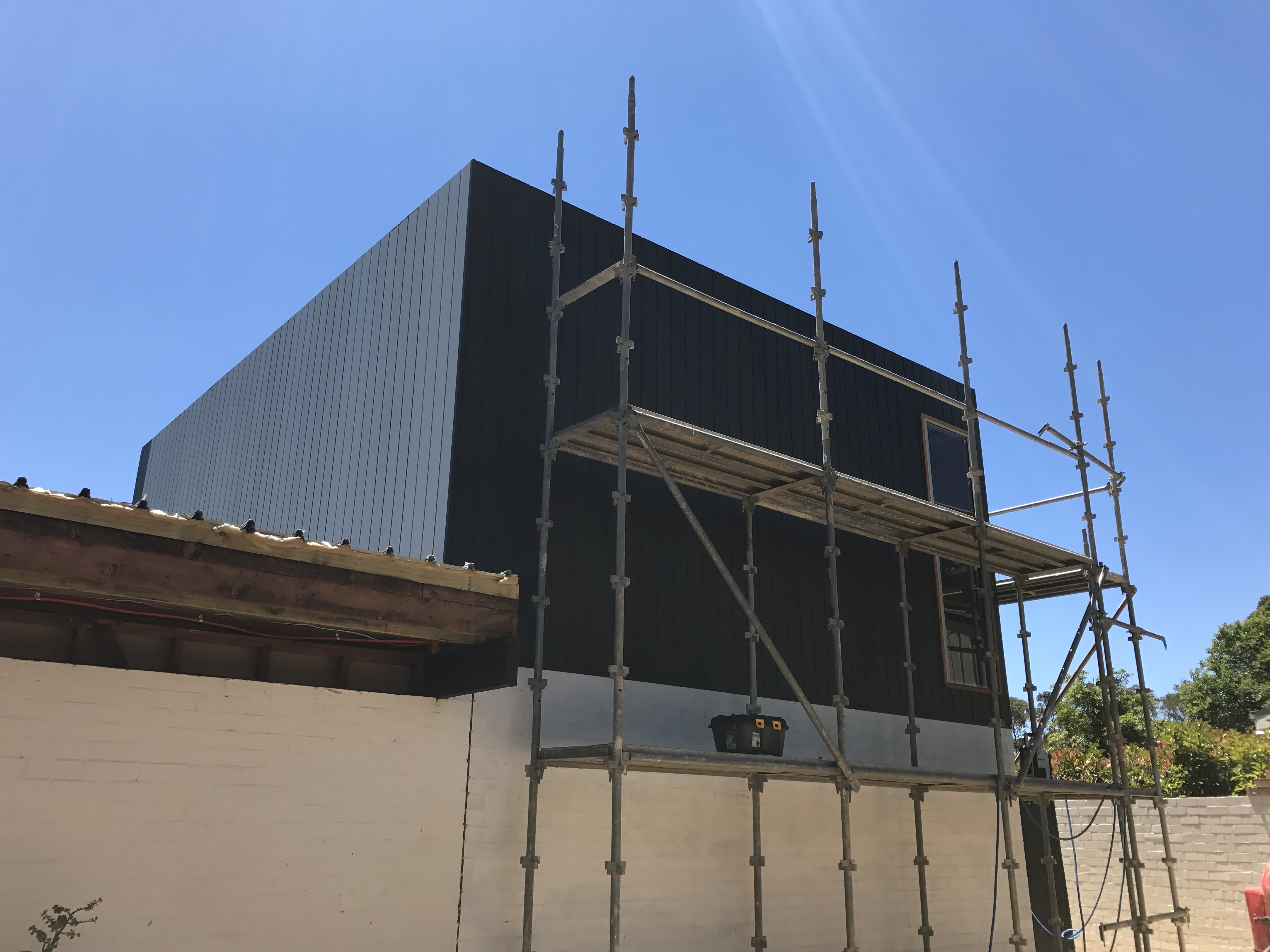 June 2016: Framework for extended living room view from the backyard/pool. Old fascia for the existing house doesn’t need removing as yet.