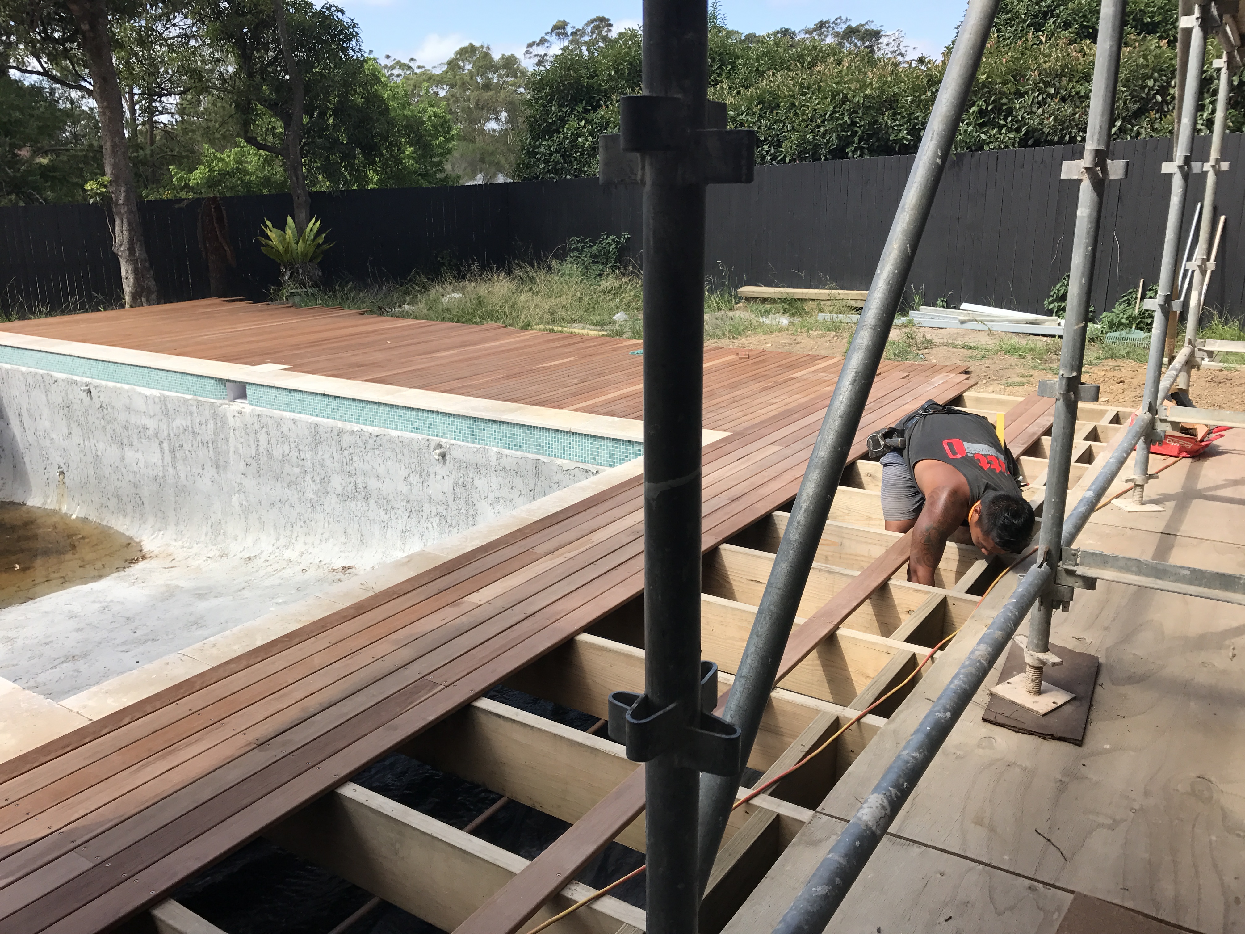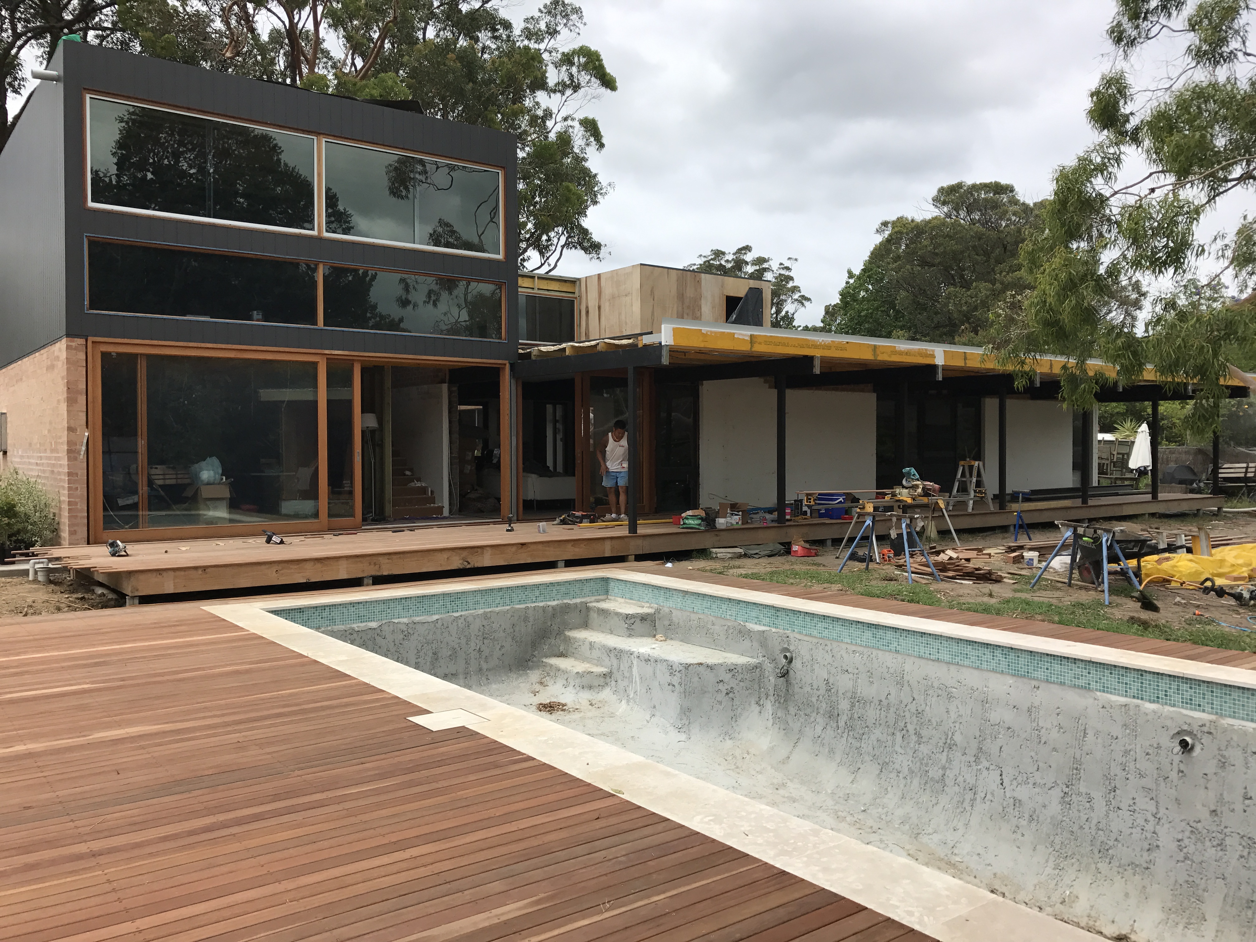 December 2016: These days, pools can’t be filled until glass fencing is completed and certified. We took on an extra carpenter called Matt and together with Kitt, some labourers and Alex…they have done an extraordinarily precise job of beautiful decking around the pool. The eaves have also been extended along the old house as planned and we hope to resolve the cover over the new extension volume. We like it open but it is a very hot northerly aspect. Thankfully it is all Low E Glass. After the glass pool fencing, the pool will be lined with a fine screed pebble in Arctic White so that the water will be truly blue, and then set. Filling the pool will help harden the surface. We decided against mosaic through out because those tiles are beautiful ….but are expensive enough to feed a small African nation. We felt we didn’t need it. Read more about the pool in the pool blog post.
