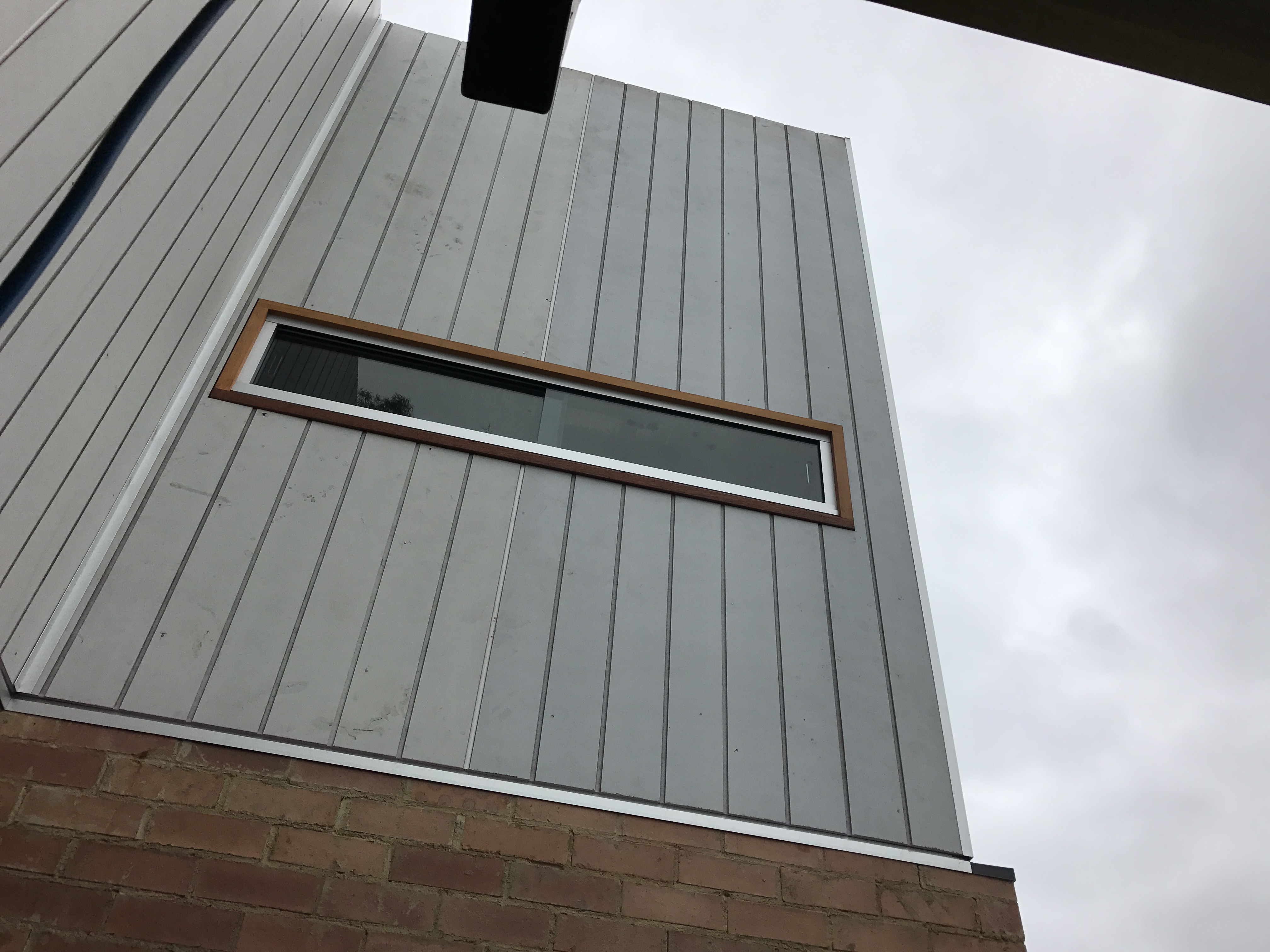 January 2017: The team have managed to clad the master bedroom extension, this is the peak-a-boo window from the bathroom (and bathtub). The cladding shown is pre-primed and will be painted in Monument, the brick below will be white.
