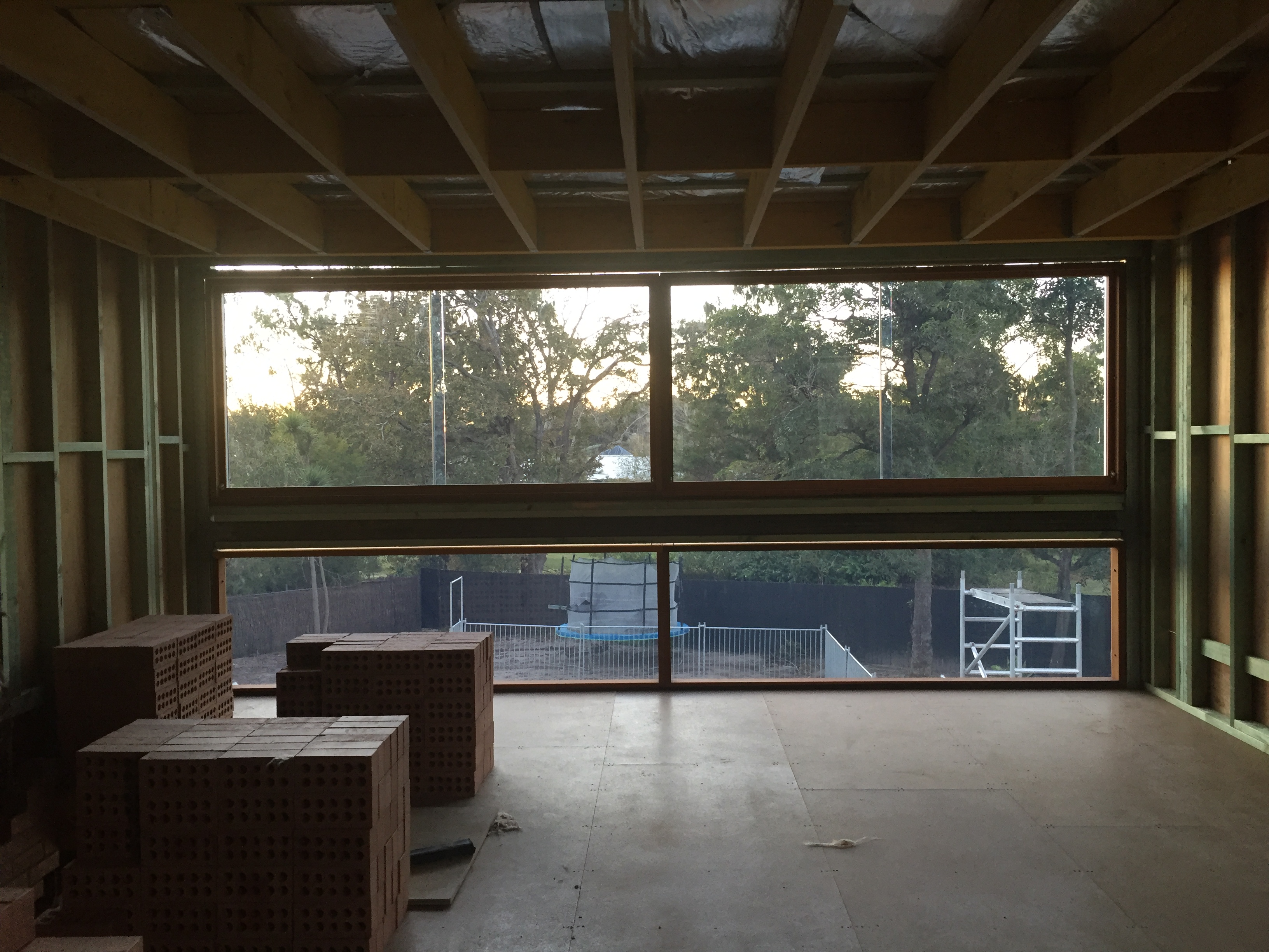 Late August 2016: Looking south east to the front, Master bedroom framework going up, as our next batch of windows will arrive in a month.