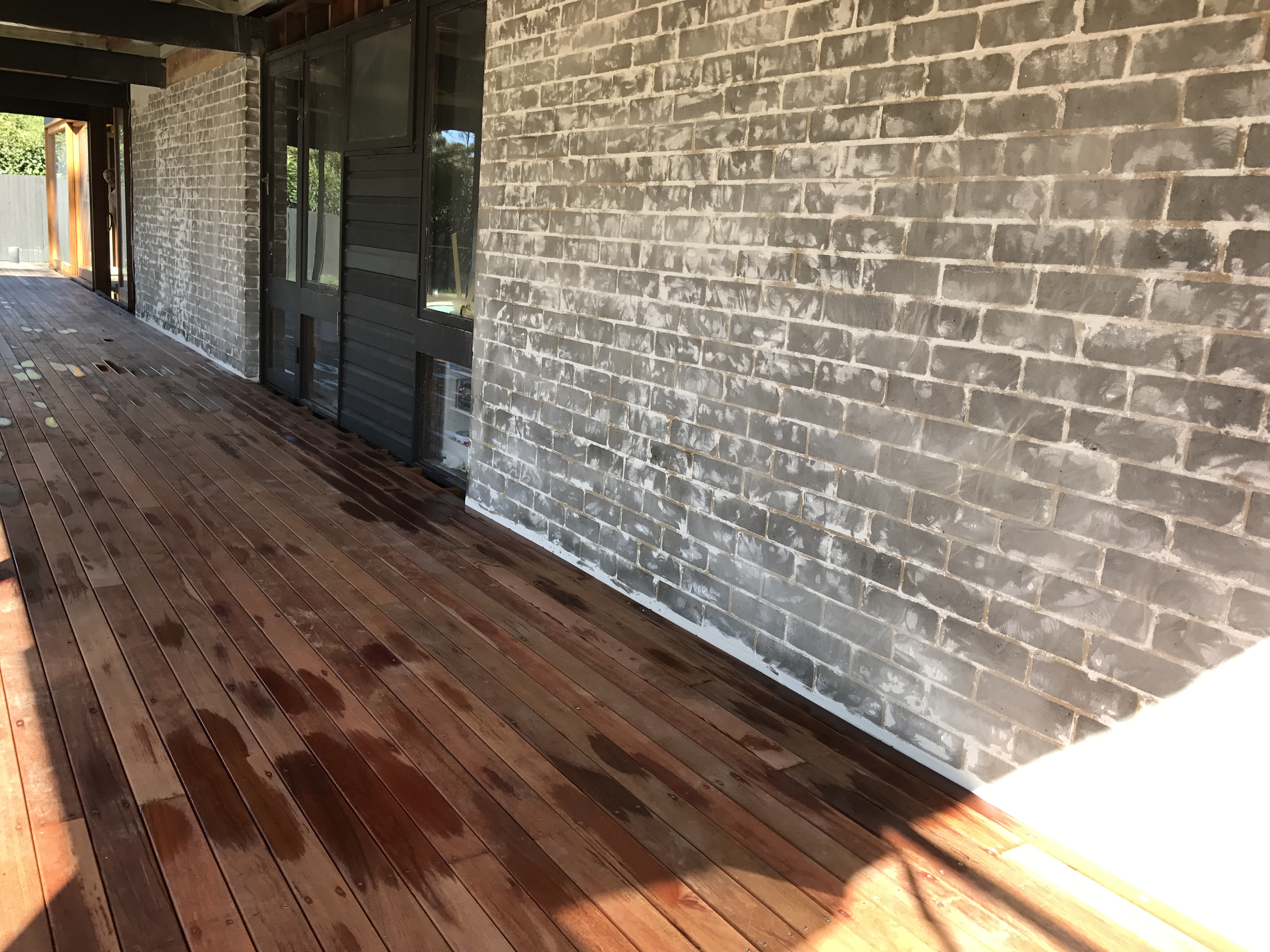 The new back deck, washed before and drying before oiling, runs along the entire rear of the original Pettit & Sevitt Lowline structure. Our bedrooms will stay much the same, we love the feel of the house inside. The original painted bricks needed to be stripped in order to take fresh paint properly. This will be restored to Dulux Natural White in keeping with the whole Lowline and bottom level.