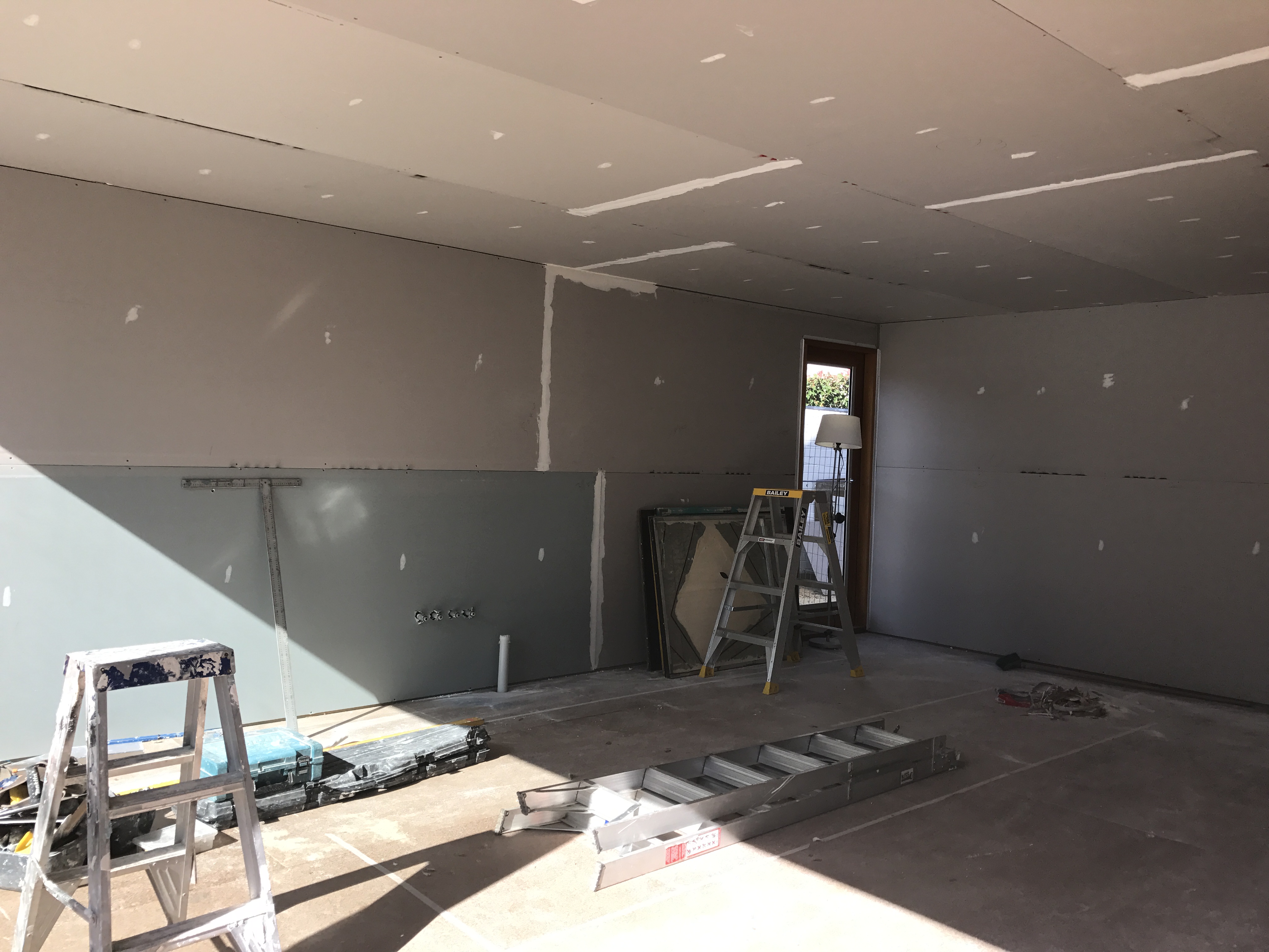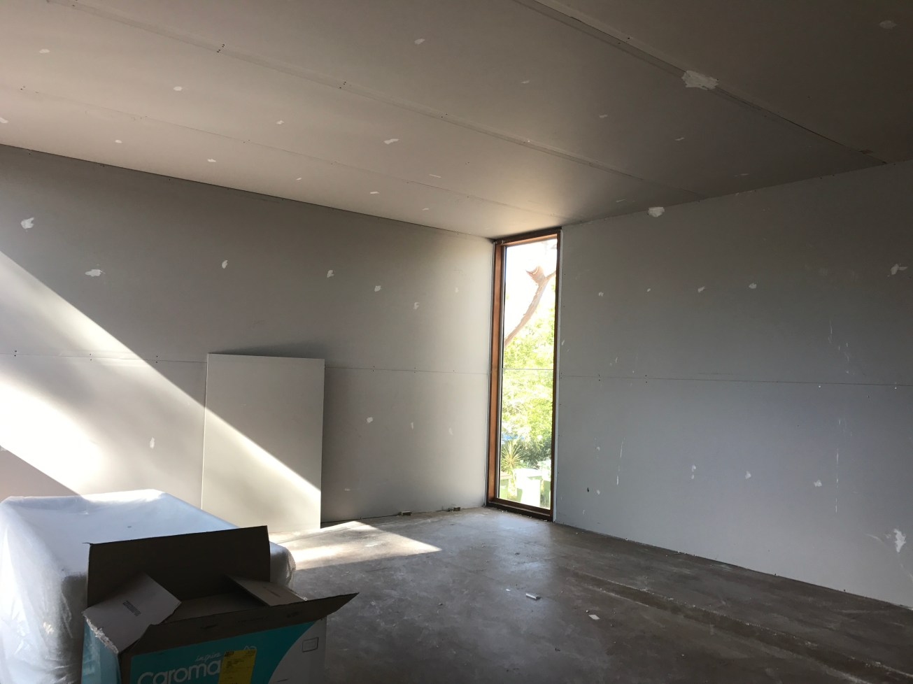 We are almost at the stage of being able to move out of the P&S bedrooms so that the old nicotine-stained walls can be removed, insulated and re-skinned. This includes the original 34sqm living/dining room which will connect through to the new kitchen. The old/1990s kitchen will revert to a room and whole Lowline bedroom area will become the much needed quiet zone. During this time, the floor-to-ceiling doors will be saved so they can be re-installed; the Oregon beams will remain and will get the benefit of eventually being re-oiled in the Japanese black stain. Getting there!