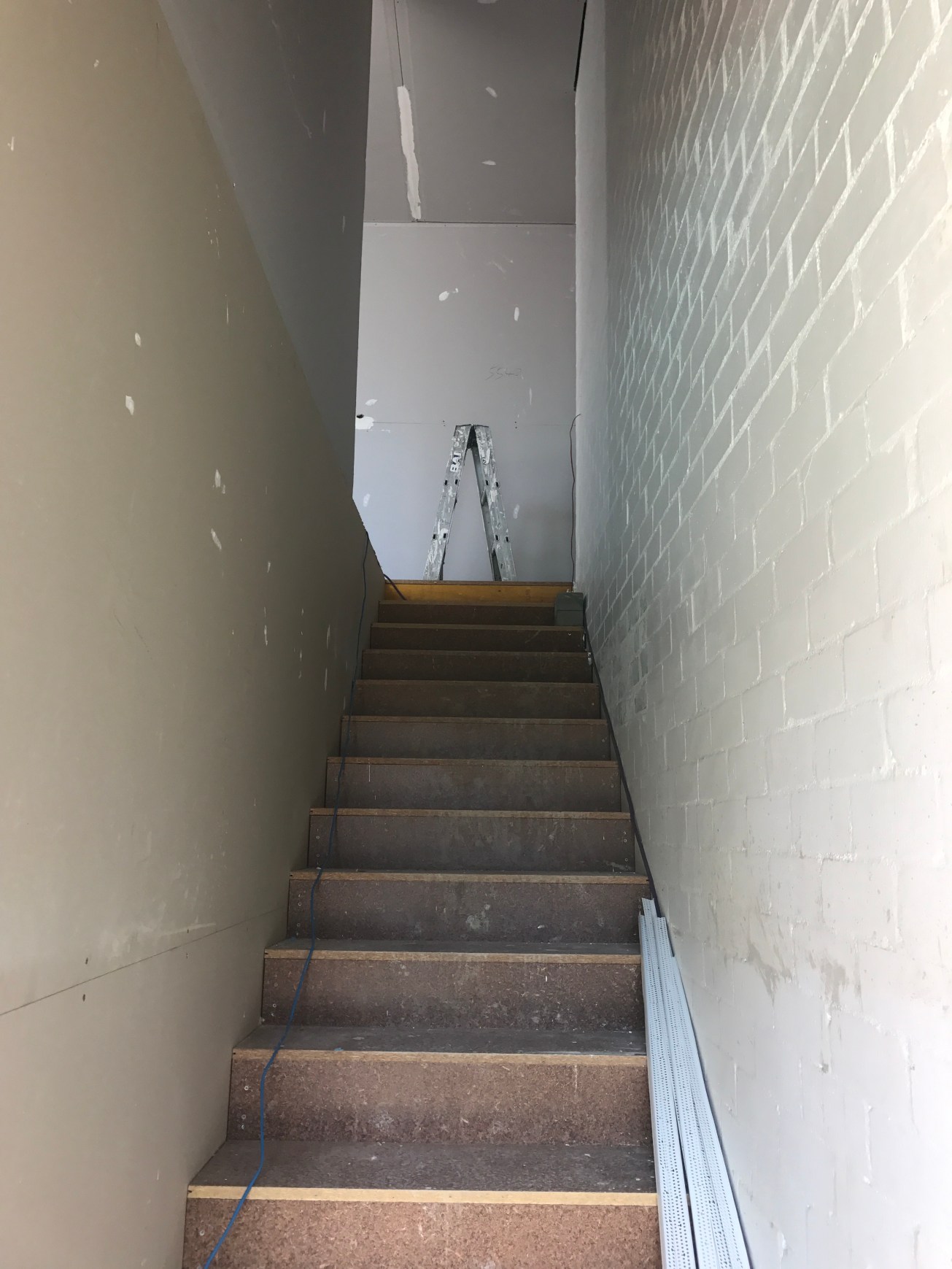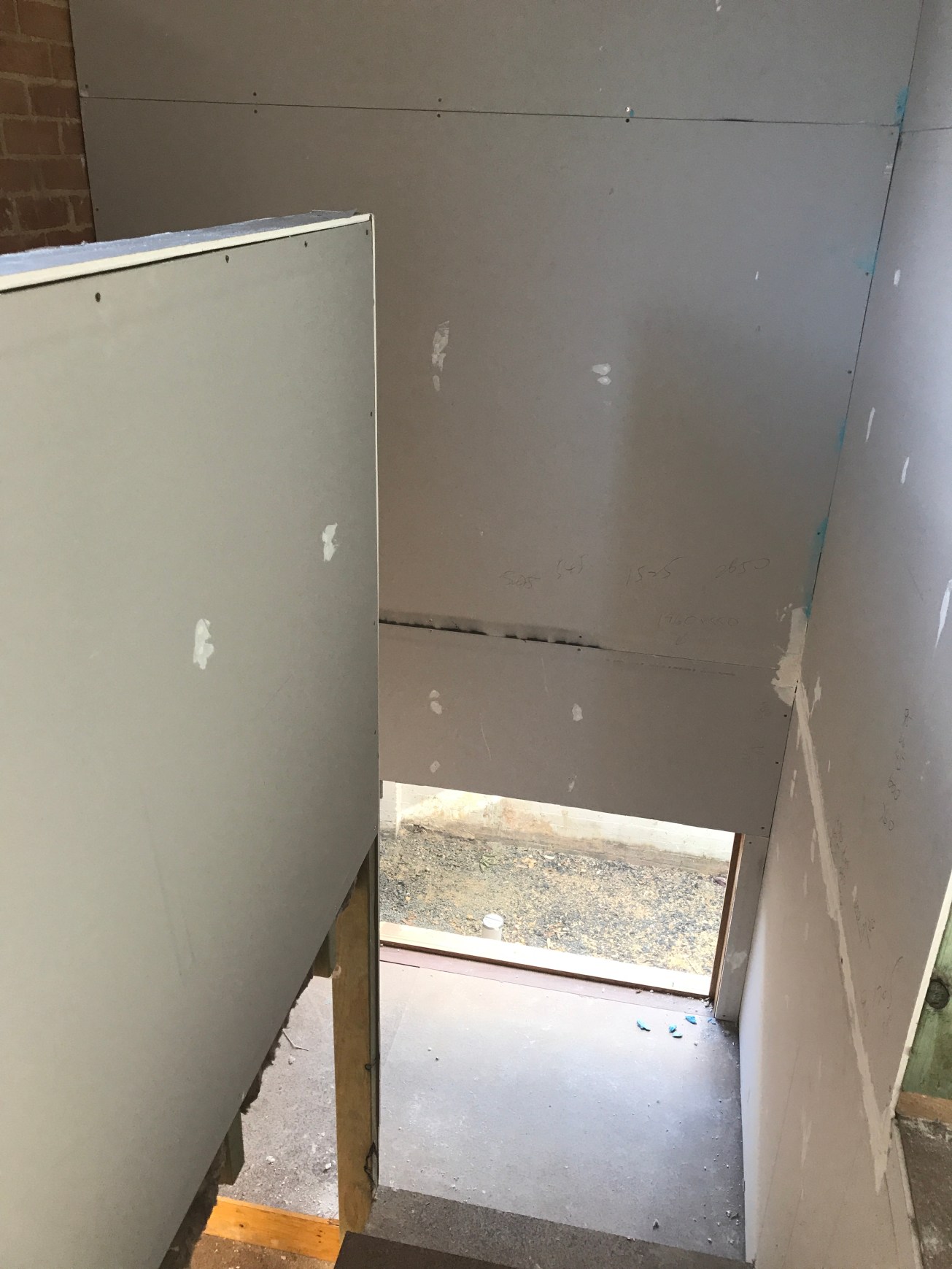 Arriving up the master bedroom stairs to the landing, with a view out. The external brick in this area was also continued from the original P&S up into the new volume. Brick will be white