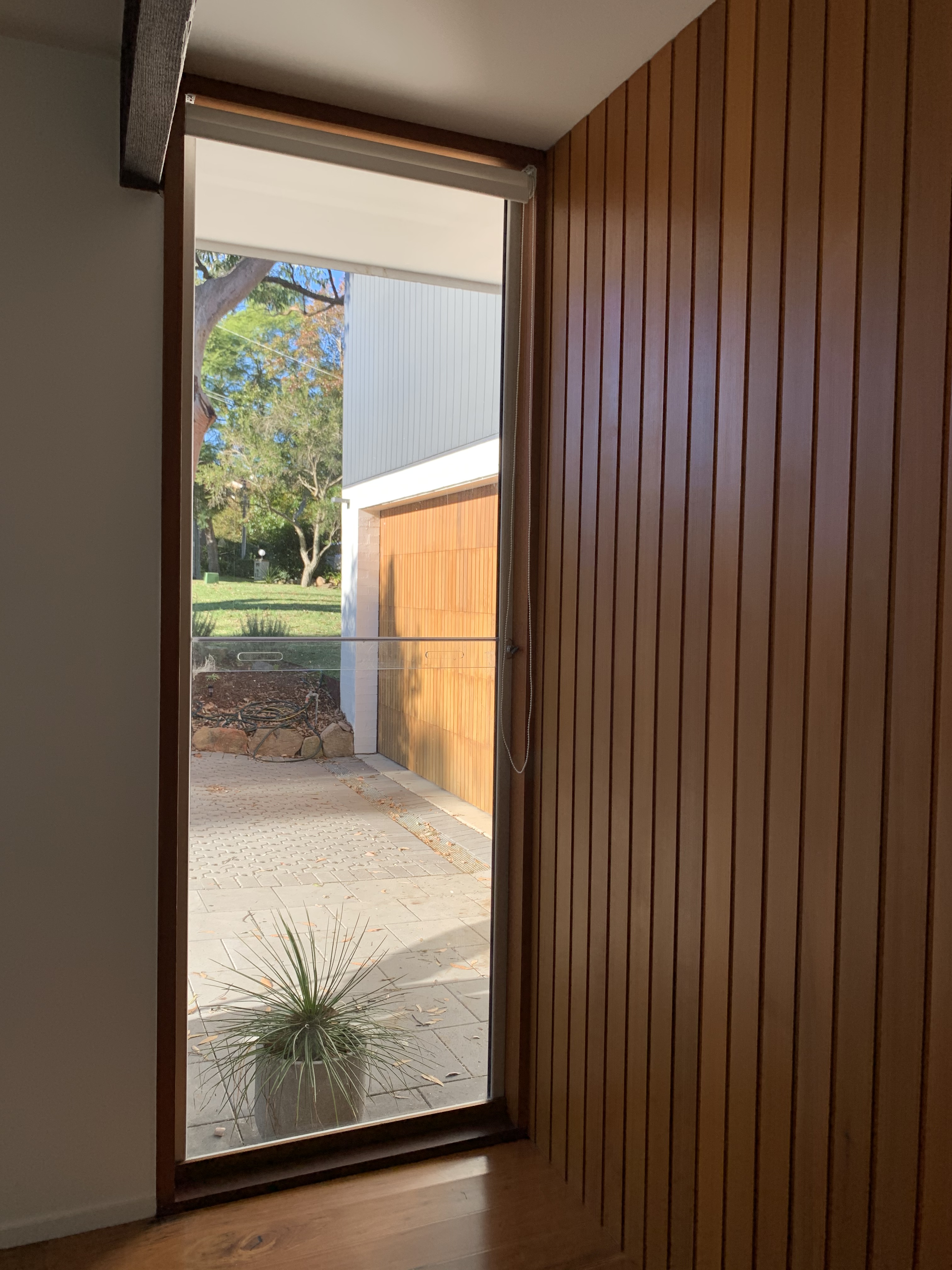 Windows that were specified for Pettit & Sevitt were timber: Western Red Cedar and often made by Stegbar at the time who manufactured the casement and sliding windows with the thick horizontal mullion and made fly screens to match, often in brown to match the oiled windows.