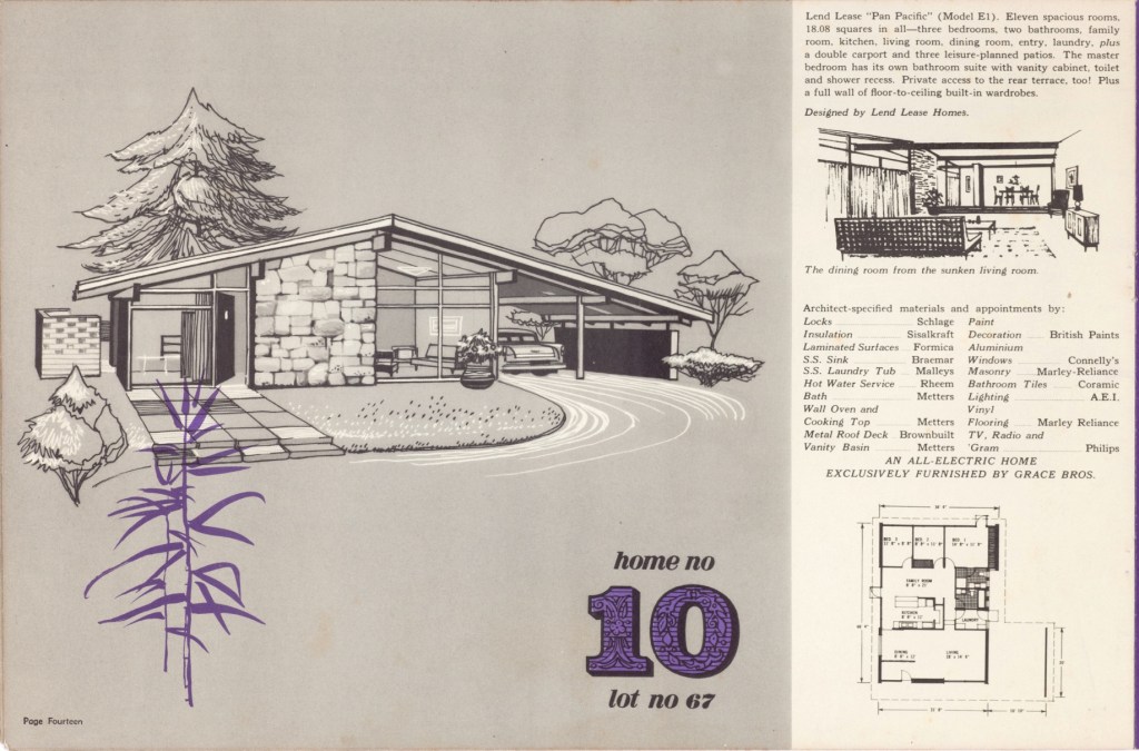 Lend Lease – another very prolific developer of post war modernist housing in Australia may have been very influenced by the lines of Eichlers. As with the Eichler business model, they also engaged architects and had many similar styles in their own catalogue… albeit simpler, with carports, smaller footprints and front windows. They also used the characteristic asymmetric pitched roof.